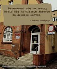 Urzędowym tempem sprawy sunęły naprzód, gdy moim oczom zza Pani Kierownik ukazał się drukowany A4 cytat-manifest, krzyczący białą kartką z ciemnobrązowych mebli, pamiętających pewnie