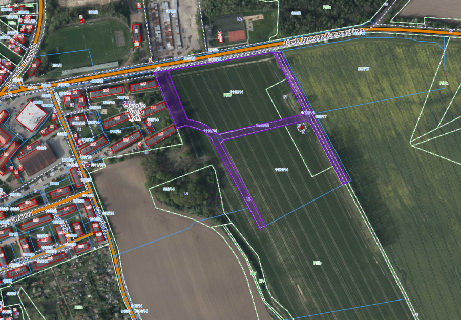 (Na mapie terenu widać osiedle Józefa Tytki, ul. Kraszewskiego i przez nas na fioletowo zabarwione tereny dróg, o których mowa w artykule)