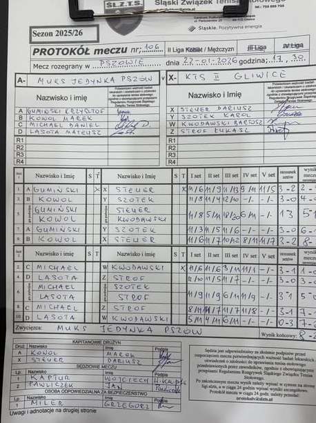 23 stycznia 2026 r. MUKS Jedynka Pszów wygrała z drużyną KTS II Gliwice 8:2, co dało im ósme zwycięstwo z rzędu, a tym samym na własnej sali pozostali niepokonani w rundzie zasadniczej. Do końca pierwszej rundy pozostał tylko jeden mecz, który odbędzie się w przyszłą środę w Bytomiu. Świetna gra pszowskich zawodników zaowocowała tym, że mają zapewnione miejsce w pierwszej ósemce 2. ligi mężczyzn i w rundzie rewanżowej będą należeć do grupy mistrzowskiej, która ma prawo rywalizować o baraże do 1. ligi
